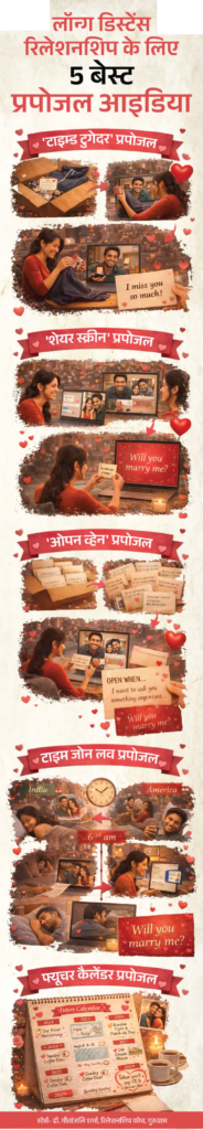 आज के दौर में प्रपोजल सिर्फ घुटनों पर बैठकर अंगूठी देने तक सीमित नहीं है। लोग अपने पार्टनर को खास महसूस कराने के लिए तरह–तरह के क्रिएटिव और पर्सनलाइज्ड तरीके अपना रहे हैं। कोई पुरानी यादों के जरिए प्यार जताता है तो कोई लॉन्ग डिस्टेंस के बावजूद डिजिटल माध्यम से प्रपोज करता है।