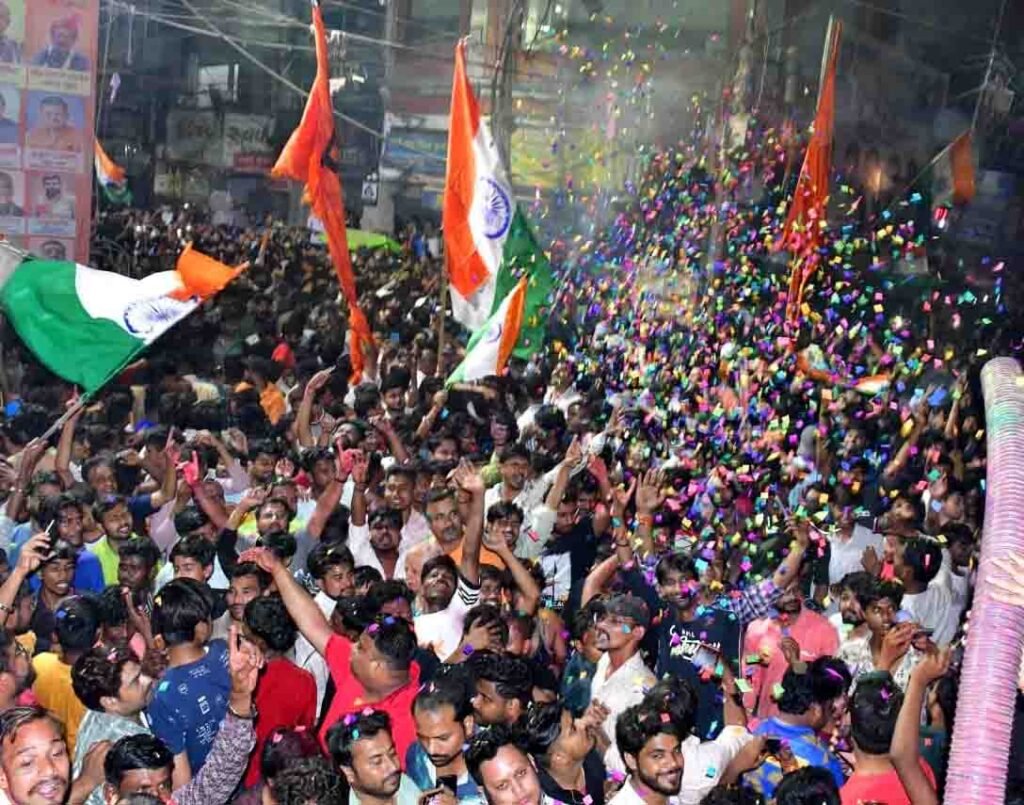 प्रयागराज। टी 20 विश्व कप में भारत की ऐतिहासिक जीत के बाद पूरे उत्तर प्रदेश में जश्न का माहौल देखने को मिला। अहमदाबाद में खेले गए फाइनल मुकाबले में टीम इंडिया ने न्यूजीलैंड को हराकर लगातार दूसरी बार टी-20 वर्ल्ड कप का खिताब अपने नाम कर लिया। जैसे ही भारत की जीत तय हुई, वैसे ही प्रदेश भर में क्रिकेट प्रेमियों ने जमकर आतिशबाजी कर जीत का जश्न मनाया।प्रयागराज में भी टीम इंडिया की जीत को लेकर लोगों में जबरदस्त उत्साह देखने को मिला। शहर में कई जगहों पर बड़ी एलसीडी स्क्रीन लगाकर लोगों ने सामूहिक रूप से मैच का आनंद लिया। शाम से ही समर्थकों की भारी भीड़ अलग-अलग स्थानों पर जुटने लगी थी और जैसे ही भारत जीत के करीब पहुंचा, सड़कों पर जश्न शुरू हो गया। शहर के लोकनाथ, जानसेनगंज, अल्लापुर और सिविल लाइंस इलाके में हजारों की संख्या में क्रिकेट प्रेमी सड़कों पर उतर आए। हाथों में तिरंगा लहराते हुए समर्थक डीजे की धुन पर नाचते-गाते नजर आए। कहीं ढोल-नगाड़ों की थाप पर लोग झूमते दिखे तो कहीं रंग-गुलाल उड़ाकर होली जैसा जश्न मनाया गया। कई जगहों पर समर्थकों ने जमकर आतिशबाजी की और “भारत माता की जय” के नारों से पूरा माहौल गूंज उठा। युवा, बच्चे और बुजुर्ग सभी इस ऐतिहासिक जीत की खुशी में शामिल होते नजर आए। शहर के लगभग हर इलाके में देर रात तक जश्न का माहौल बना रहा।